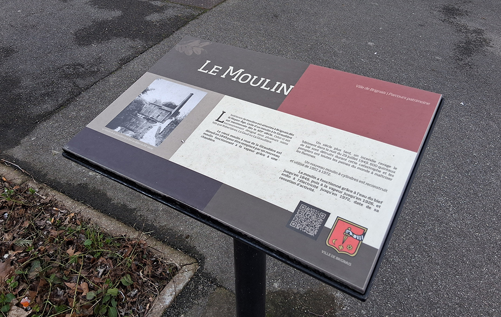 Dating back to the 14th century, this mill was supplied by a bief (mill race) that was filled in 1956 during the creation of Avenue de Verdun. The mill reflects Brignais’ long industrial evolution: powered by water until 1864, steam until 1926, and electricity until 1972, when activity ceased.